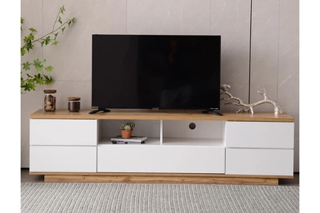 Avec ses lignes épurées et ses finitions bois naturel et blanc, ce modèle de 180 cm avec 5 portes et 8 compartiments est idéal pour une déco sobre et fonctionnelle dans un salon contemporain.
